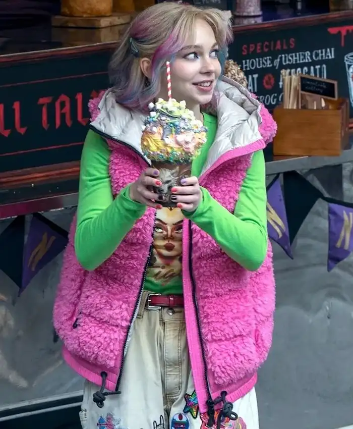 Beyond its material and construction, the Emma Myers Pink Vest embodies the character’s playful sophistication and on-screen presence. Fans of Wednesday can embrace a piece of her iconic style while enjoying a comfortable, fashionable, and functional wardrobe item.
