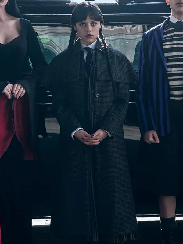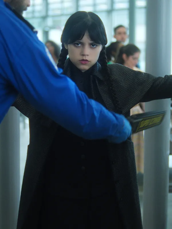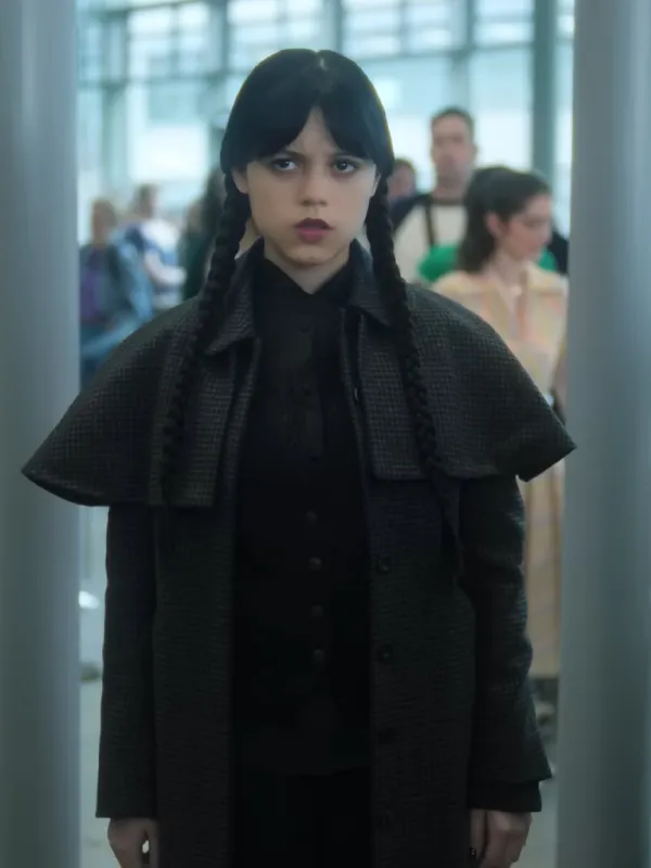 This black coat echoes Wednesday’s brooding elegance. Its deep shade absorbs light like the shadowed halls she wanders quiet but unmistakable in presence.